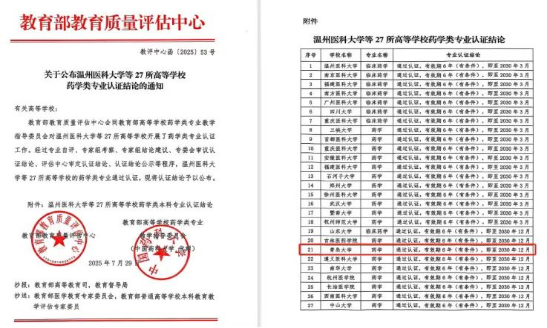 近日,据教育部教育质量评估中心会同教育部高等学校药学类专业教学指导委员会发布的《关于公布温州医科大学等27所高等学校药学专业认证结论的通知》(教评中心函〔2025〕53号),我院药学专业经过严格评审,顺利通过教育部药学类专业认证,认证有效期6年,至2030年12月。这标志着我院药学专业的办学质量、人才培养体系和综合实力获得了国家层面的权威认可。