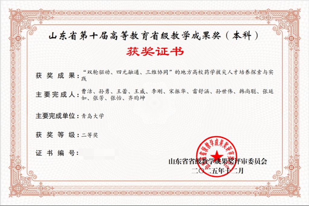 近日,山东省教育厅正式印发《关于公布第十届高等教育省级教学成果奖获奖名单的通知》(鲁教高函〔2025〕30号),我院曹洁教授组织申报的《“双轮驱动、四元融通、三维协同”的地方高校药学拔尖人才培养探索与实践》荣获二等奖。这是我院首次荣获省级教学成果奖,标志着学院在教育教学改革、人才培养质量和教学创新能力等方面取得了阶段性、标志性成果。